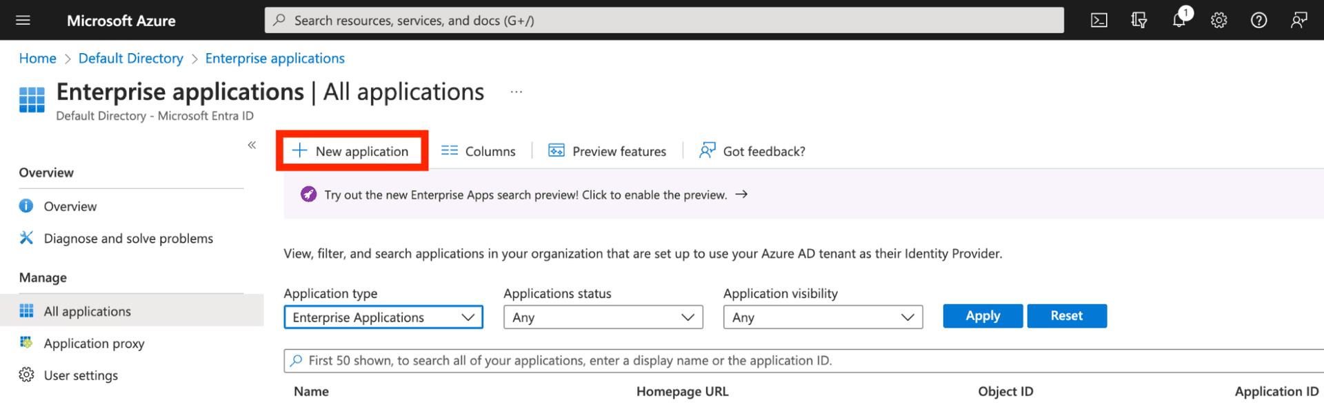 - From the left navigation, select Enterprise Applications: