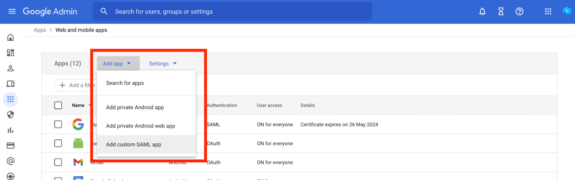 - Open the Add app dropdown menu and select Add custom SAML app: