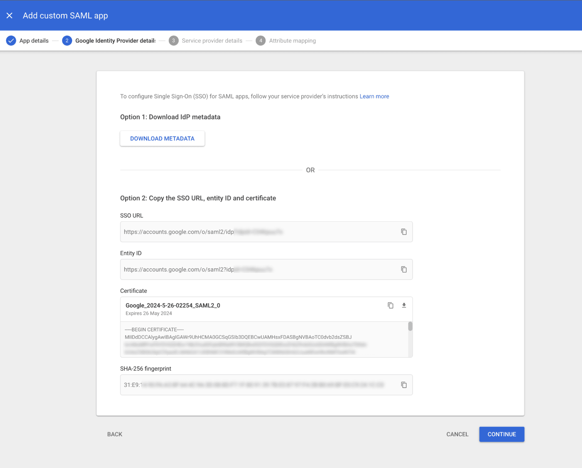- Save the data required for SSO configuration in Buddy for later use: SSO URL, Entity ID, and the certificate. Click Continue: