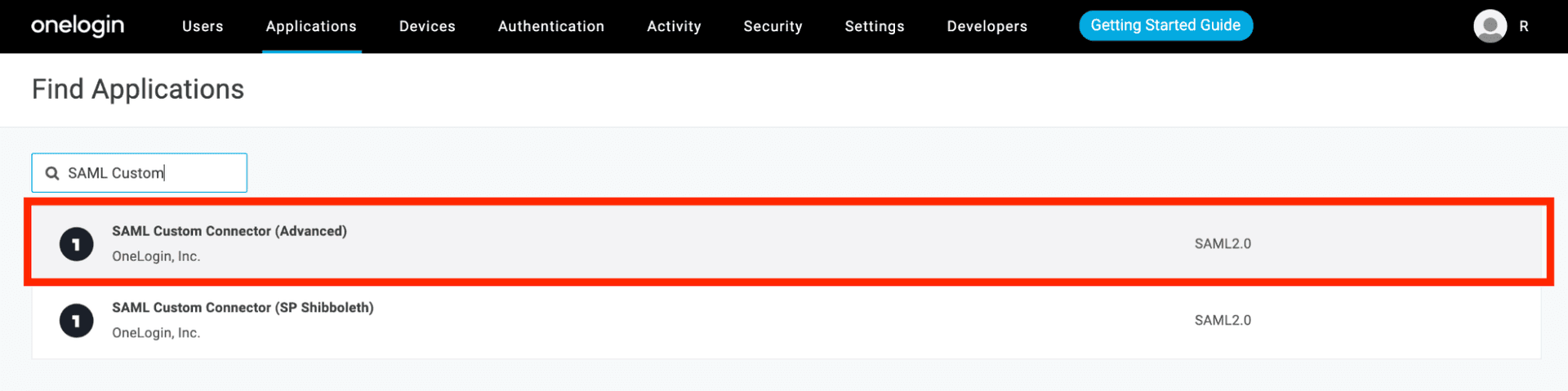 - Select SAML Custom Connector (Advanced) from the list. Use the search filter to find this option: