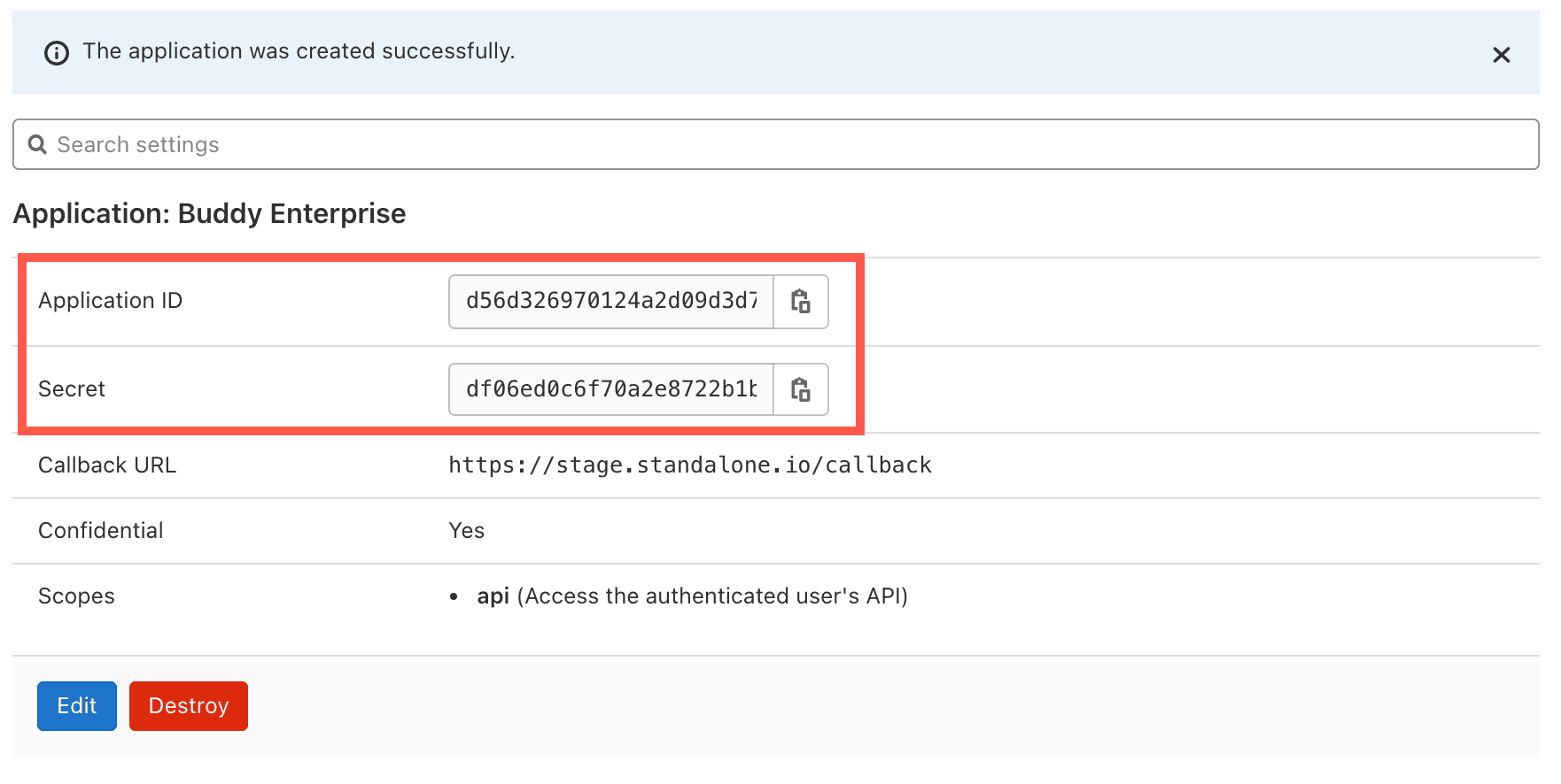 Buddy - Redirect URI → paste the Callback URL copied from Buddy self-hosted