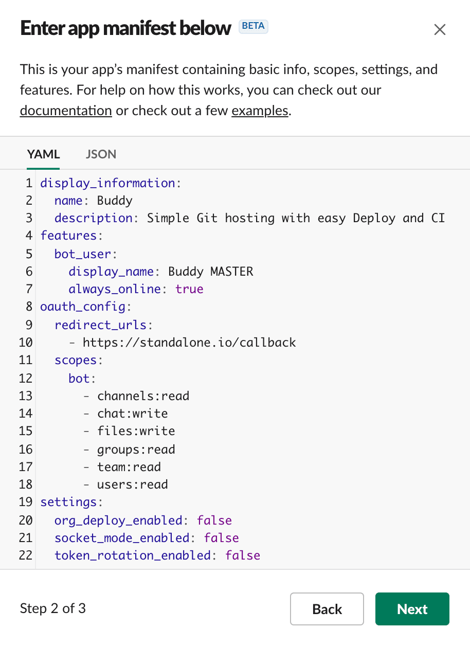 yamldisplay_information: name: Buddy description: Simple Git hosting with easy Deploy and CI features: bot_user: display_name: Buddy Self-Hosted always_online: true oauth_config: redirect_urls: - https://{YOUR_INSTANCE_URL}/callback scopes: bot: - channels:read - chat:write - files:write - groups:read - team:read - users:read settings: org_deploy_enabled: false socket_mode_enabled: false token_rotation_enabled: false