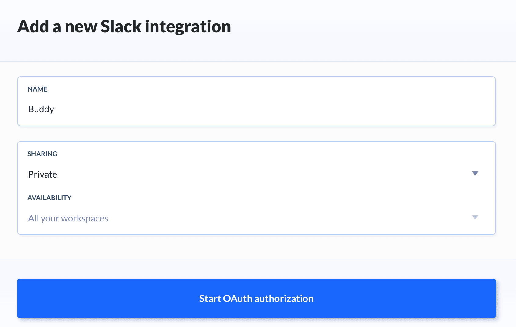 - Define the name of the integration and click Start OAuth authorization.