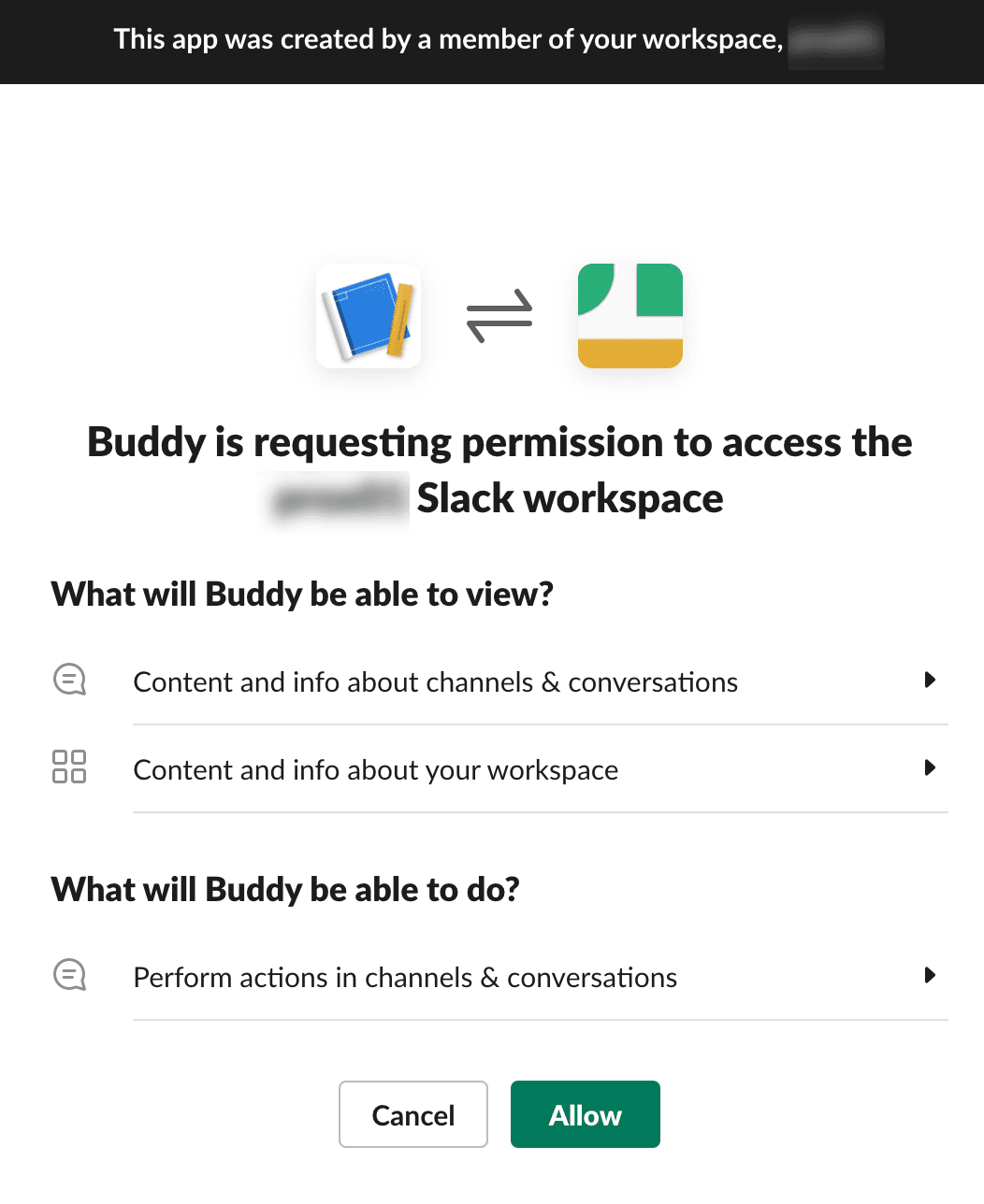- Click Allow to give Buddy access to your Slack workspace.