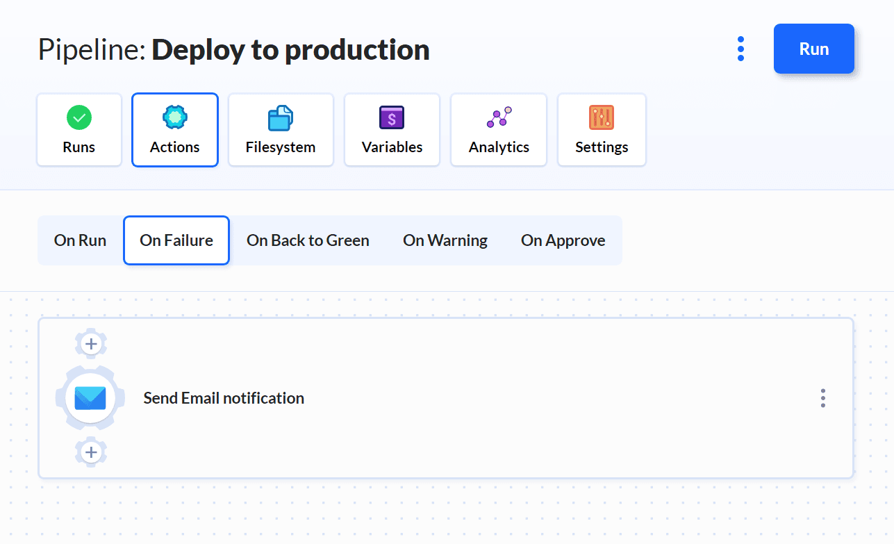 The last action will send a notification in case something goes wrong. Switch to the On failure section of the pipeline and add a notification action of your choice: