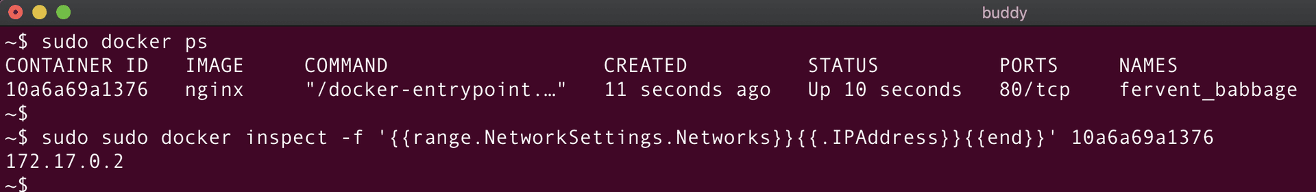 bashsudo docker inspect -f '{{range.NetworkSettings.Networks}}{{.IPAddress}}{{end}}' <container_name or container_id>$