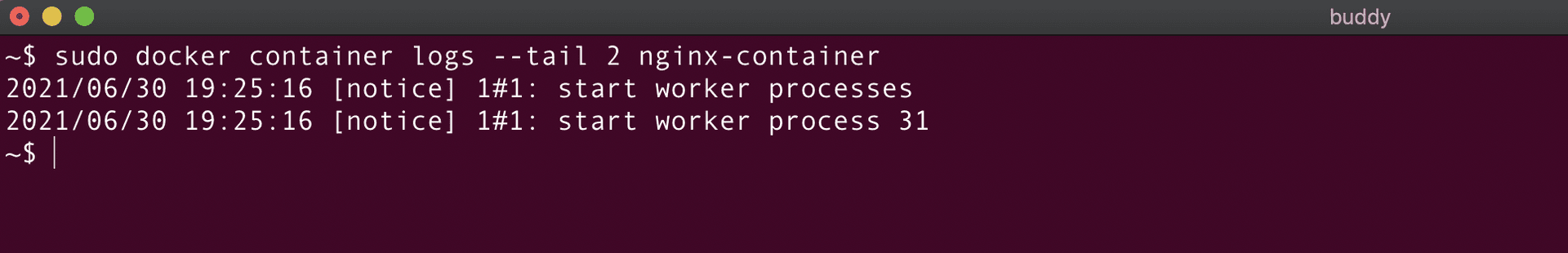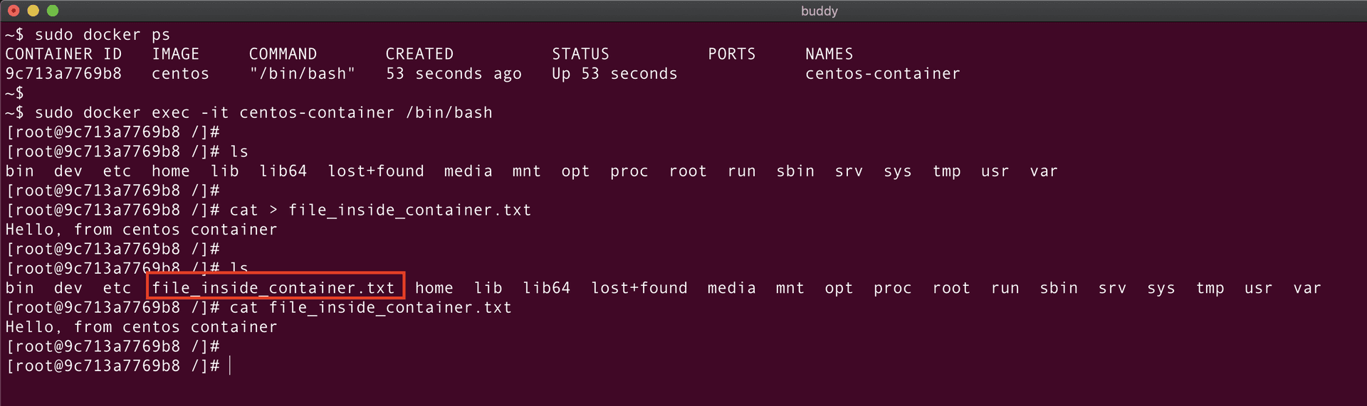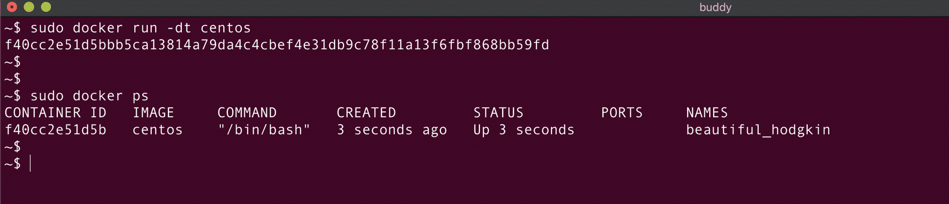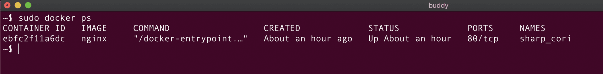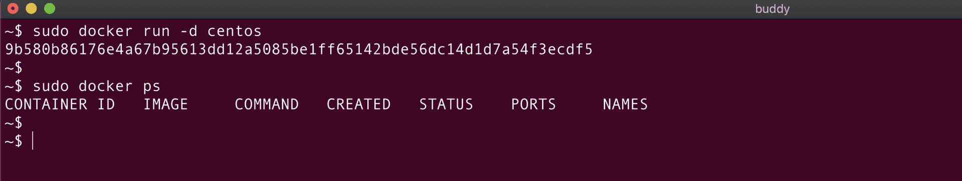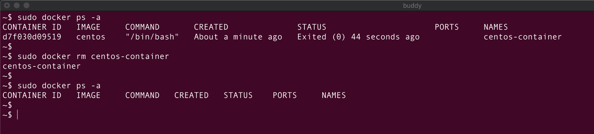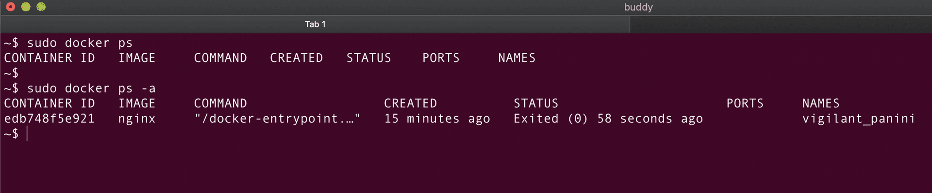 If we end the terminal session by closing the terminal tab or by pressing CMD+C/CTRL + C, the container should die automatically. Running docker ps will confirm this is what indeed happened: