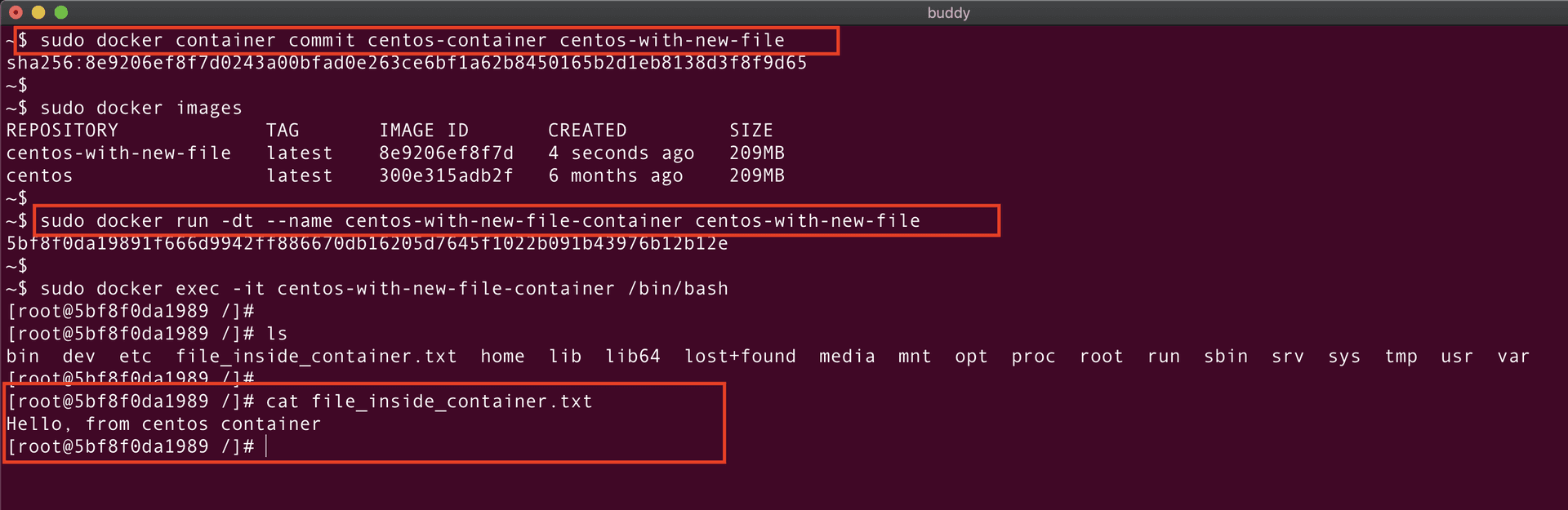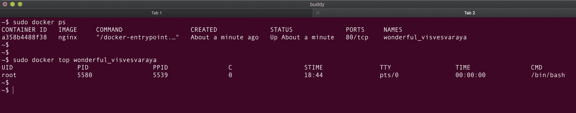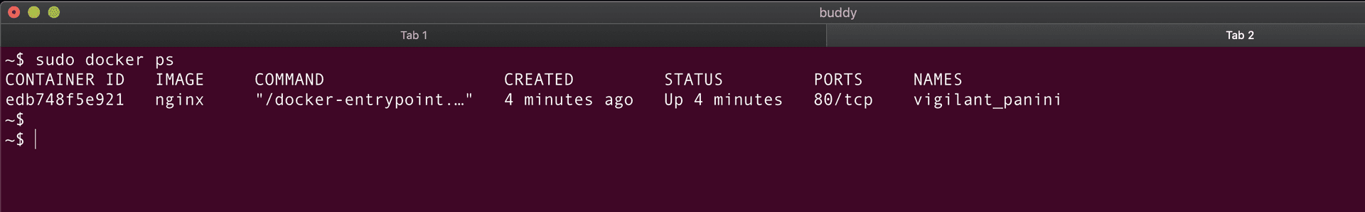 Let's launch a new terminal tab and check the status of the container. We can see the container was created and is running: