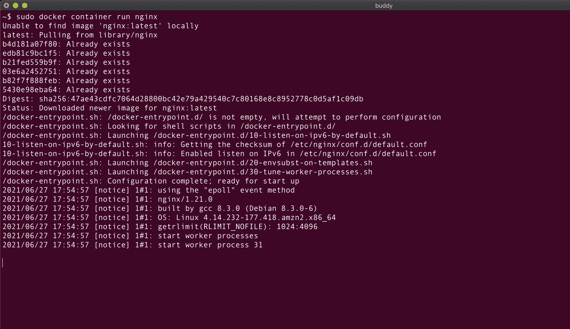 Let's create and run a container in the foreground mode using the nginx Docker image: