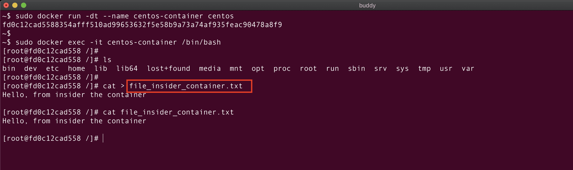bashdocker run -it --name <container_name> --mount type=bind,source=/path/on/host/,target=/path/on/container first-image$