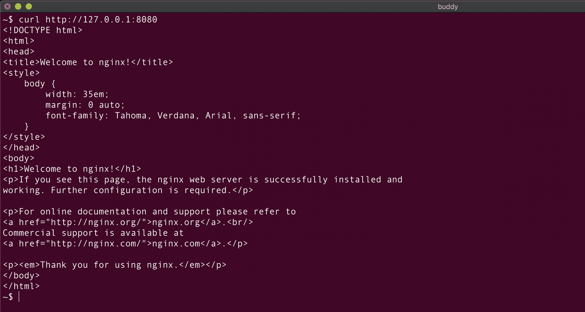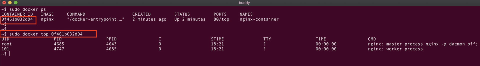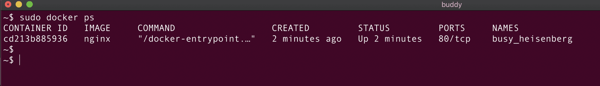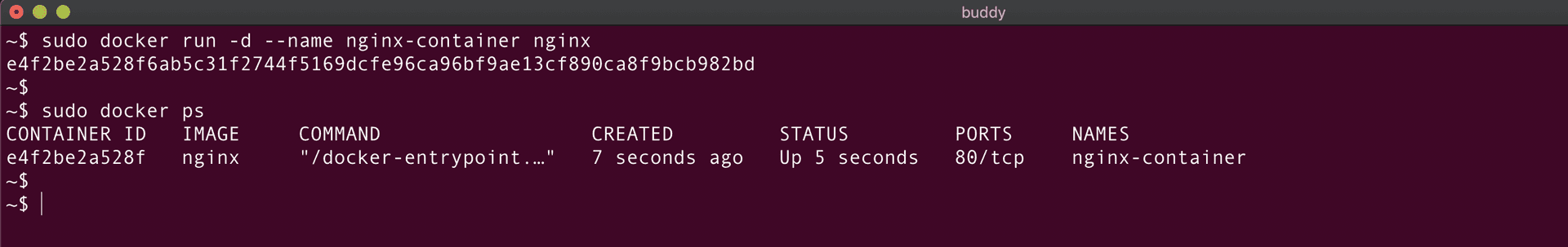 As seen from the above screenshot, nginx-container is created and the docker ps command is used to verify the status of the container.