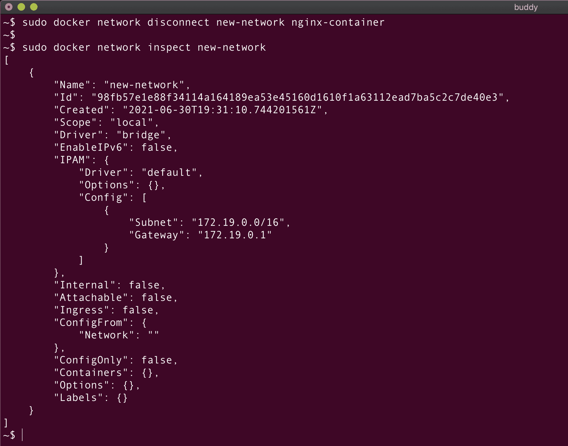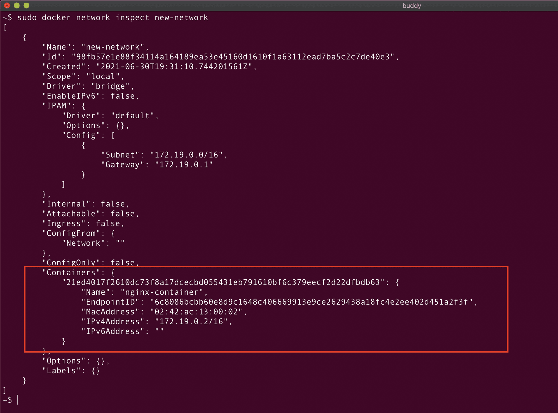 The container nginx-container is connected to the network new-network. We can verify this using docker network inspect: