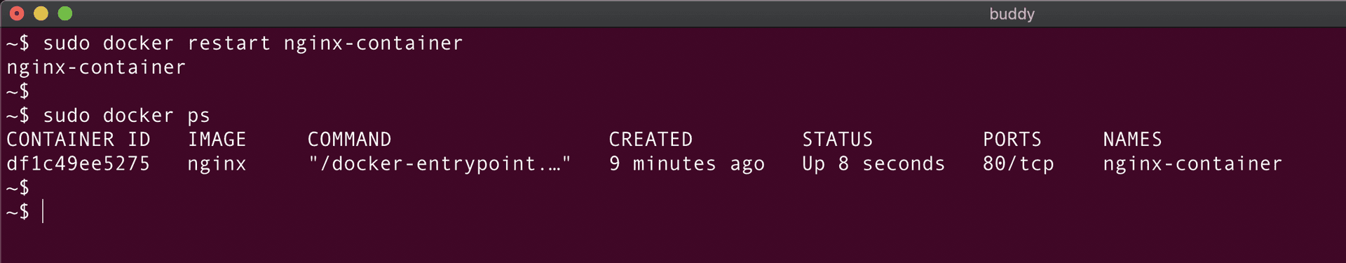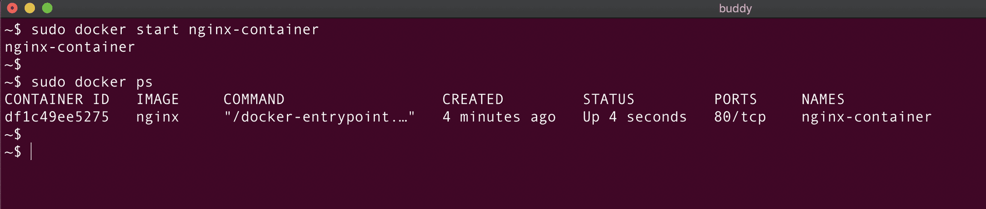 We can use the docker start command either using the container ID or name. This means we can also start it as: